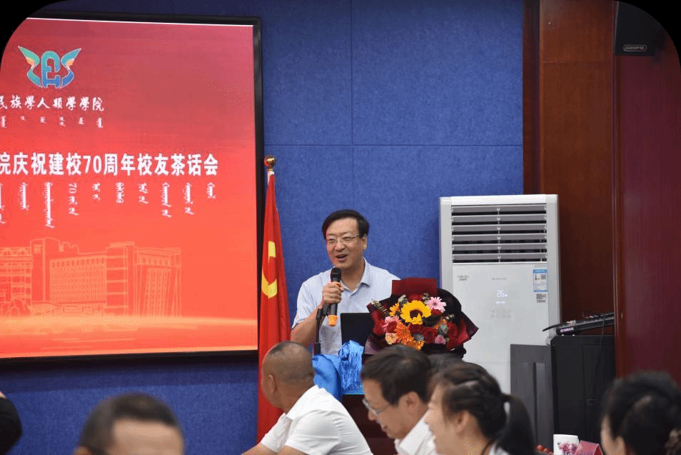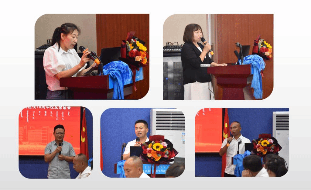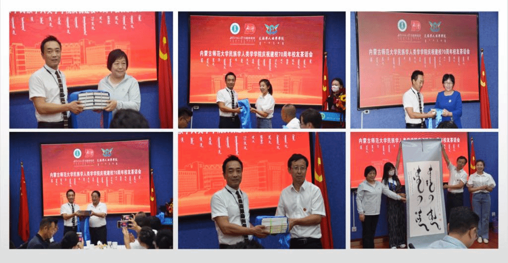 校友代表王海荣研究员(内蒙古社会科学院草原文化研究所)、王海玲副教授(内蒙古农业大学)、段炼校长(呼和浩特市圣恩职业培训学校)、包黎明主任(科左后旗甘旗卡镇哈图塔拉嘎查村支部书记村主任)、乌云必力格主任(通辽市科尔沁区科尔沁街道办事处主任)纷纷发言,畅叙求学师大的感人故事,表达了对母校深深的怀念之情。活动现场,王来喜教授、乌日陶克套胡教授、包玉山教授、巴·孟和教授等学院资深教授与校友们交流互动,对昔日学生如今取得的卓越成就表示了高度赞扬,并嘱托校友不忘母校的栽培,为社会发展做出更大的贡献,校友们也对恩师们的悉心教导表达了感恩之情。