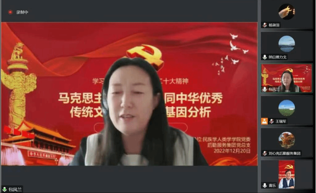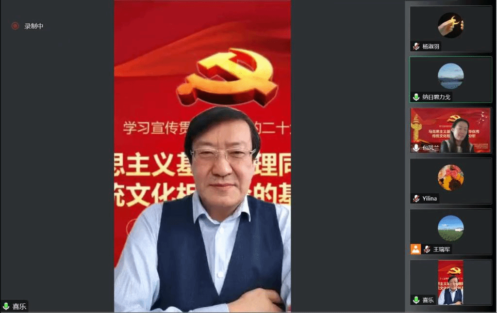12月20日下午,我院党委联合后勤服务集团党总支,邀请校党委委员、副校长王来喜教授,做“马克思主义基本原理同中华优秀传统文化相结合的基因分析”为题目的二十大精神线上辅导讲座。讲座由beat365官网党委书记包凤兰主持,学院师生党员及后勤服务集团环节干部、党员及积极分子200多人线上聆听讲座。