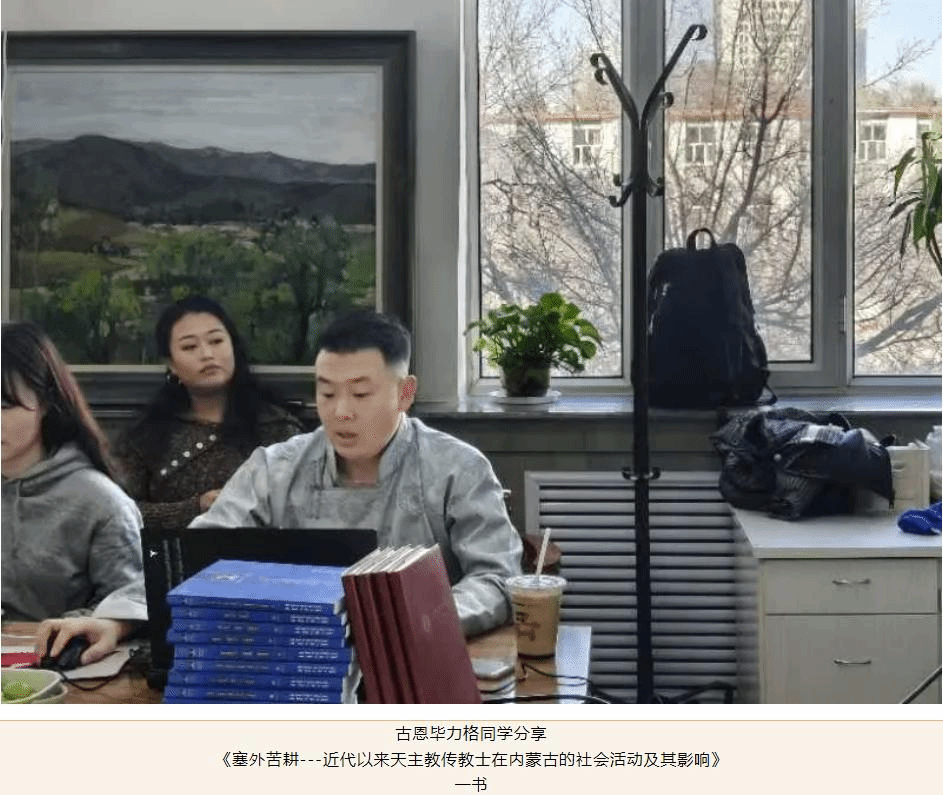 首先,由古恩毕力格同学与舒日歌同学分享书籍。古恩毕力格同学分享了由刘青瑜所写的《塞外苦耕---近代以来天主教传教士在内蒙古的社会活动及其影响(1865--1950)》一书。这本书从社会文化史的角度,在概述传教史的基础上,重点研究传教士在内蒙古除传教以外的活动,包括社会和科研活动,进而总结这些活动对内蒙古近代社会的影响。