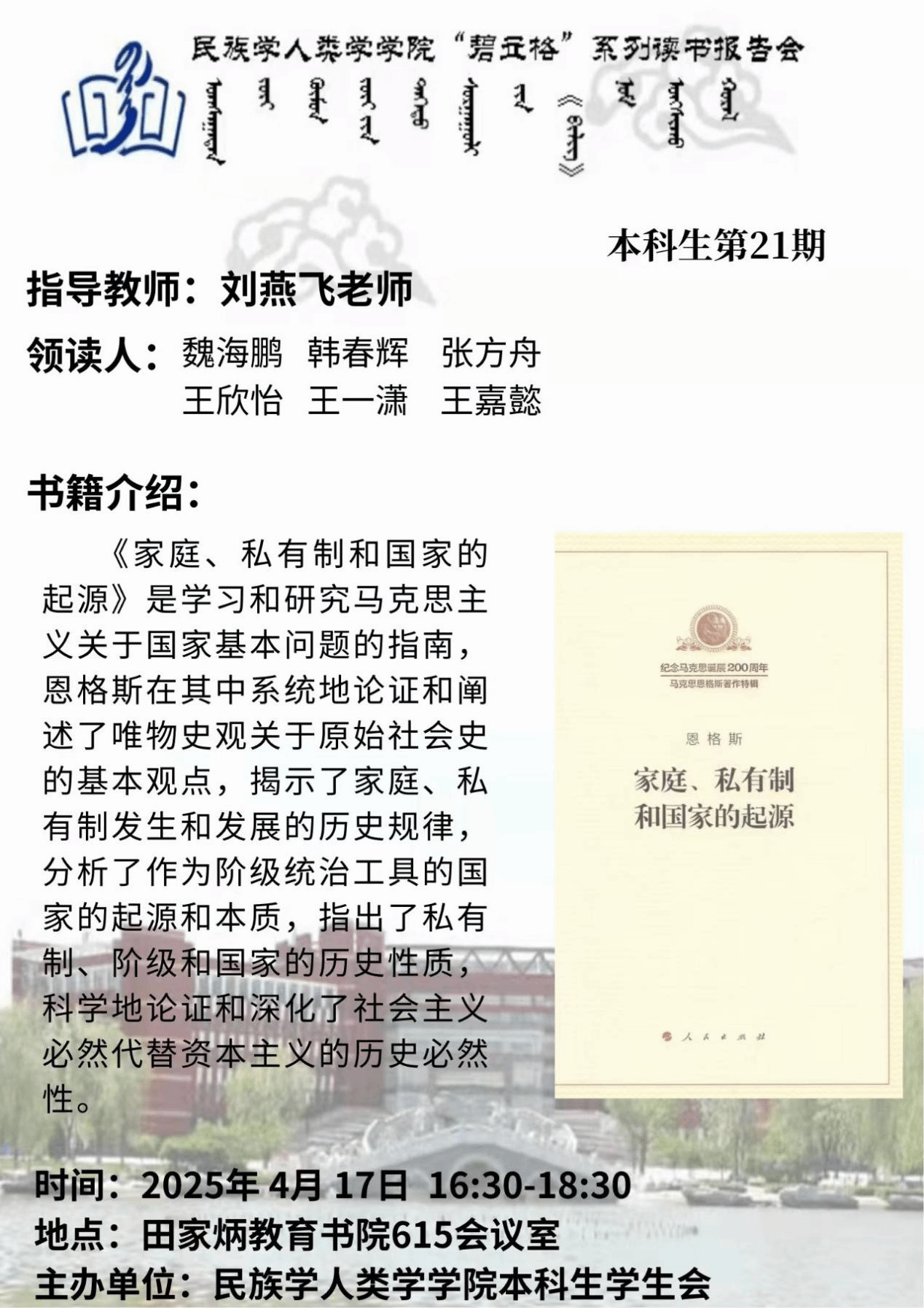 为丰富专业认知、拓宽专业视野,beat365官网秉持笃学致知以夯基础、开卷启思以拓思路、读书明智以塑品格的理念, 致力于营造积极向上、勤勉求知的学风。 4月17日下午,本科生第21期“碧立格”系列读书报告会在田家炳教育书院615会议室成功举行。本期读书会由刘燕飞老师指导,6位同学领读,阅读书目是恩格斯的《家庭、私有制和国家的起源》。