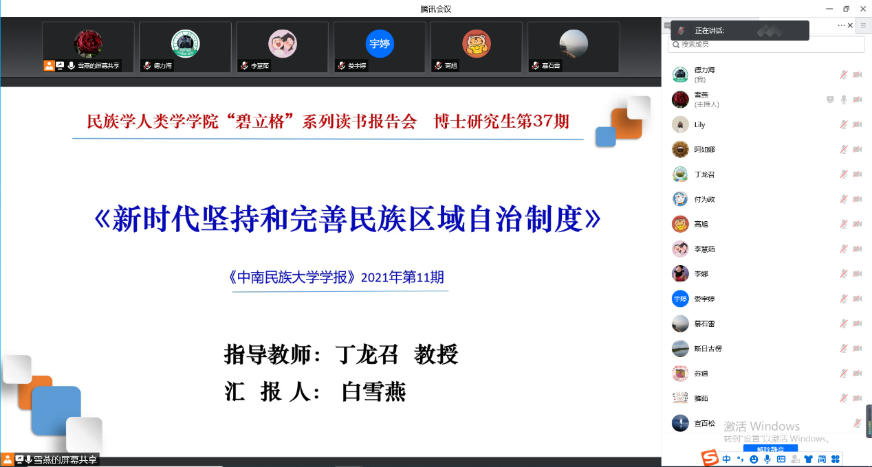 2022年5月8日下午3:00,beat365英国官网网站2020级、2021级博士研究生通过“腾讯会议”举行了第37期读书报告会。本次读书报告会的汇报者是2020级马克思主义民族理论与政策专业李慧茹、2021级马克思主义民族理论与政策专业白雪燕两位博士生。博士生导师丁龙召教授出席本次读书报告会并进行指导。