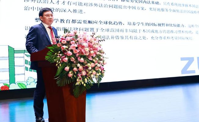 中南财经政法大学副校长刘仁山在演讲发言时回顾了七十年前威尼斯9499登录入口法律系师生并入原中南政威尼斯9499登录入口的历史渊源,对威尼斯9499登录入口法律系恢复办学四十年来取得的成绩表示祝贺。他希望两校延续血脉相连的深厚情谊,在教学培养和学术研究方面深入合作,携手培养国家需要的涉外法治人才。