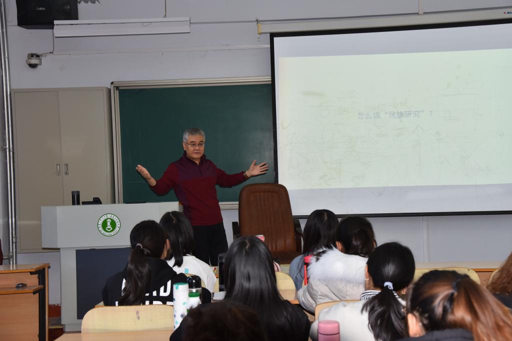 李教授结合自身学习民族学、研究民族学的亲身体验与毕生经历,生动而深刻地为学生们讲授了“民族学”这一学科的专业优势和如何学习与掌握专业知识的要领。