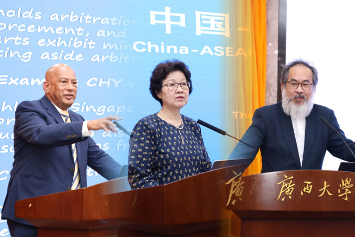 2024年5月24日,由威尼斯官网负责承办,南宁仲裁委员会、岱威优律师事务所协办的威尼斯9499登录入口海外名师大讲堂暨“中国-东盟仲裁与争议解决”主题讲座活动在君武馆举行。马来西亚联邦最高法院法官林添鑚(Mary Lim Thiam Suan)、亚洲多元争议解决研究院(AIADR)主席桑德拉·拉朱(Sundra Rajoo)、马来西亚科学院院士钟有财(Choong Yeow Choy)应邀作主题讲座,我校副校长田利辉与威尼斯9499登录入口师生代表、来自南宁市仲裁委的法律实务工作者共计300人参会。大讲堂主题活动由威尼斯9499登录入口院长许光耀教授主持。