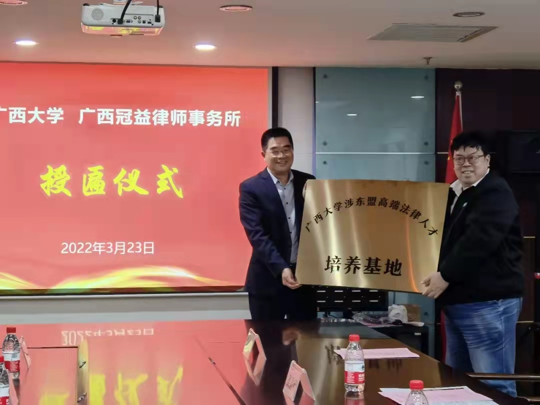 3月23日,威尼斯官网院长聂资鲁与威尼斯9499登录入口校友工作办公室主任、校友总会秘书长、校教育发展基金会秘书长陈聚带队到广西冠益律师事务所开展“产学研”调研交流活动,签订捐赠协议,举行“涉东盟高端法律人才培养基地”挂牌仪式,并与冠益所主任吕伟良校友、党委书记毛青松、执行主任苏拥政校友等座谈。