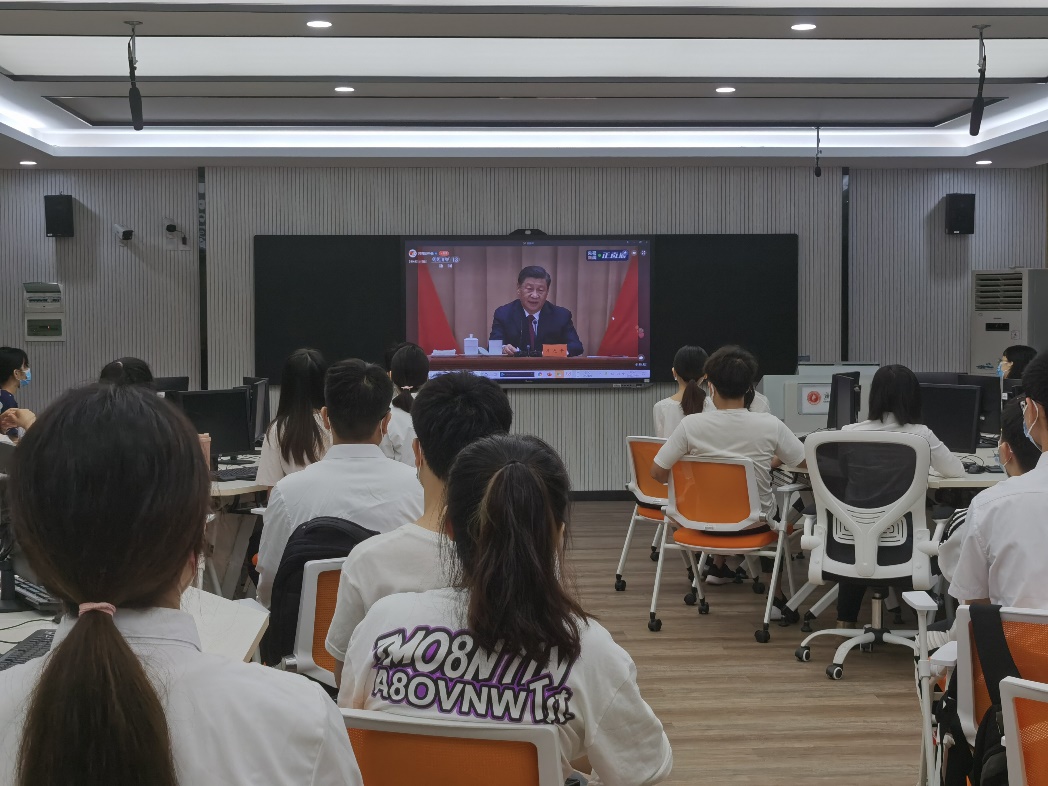 2022年5月10日上午10时,威尼斯9499登录入口青年老师、本科2019级各团支部团员代表、学生会骨干在威尼斯9499登录入口402教室观看庆祝中国共产主义青年团成立100周年大会直播,并认真学习习近平总书记重要讲话。